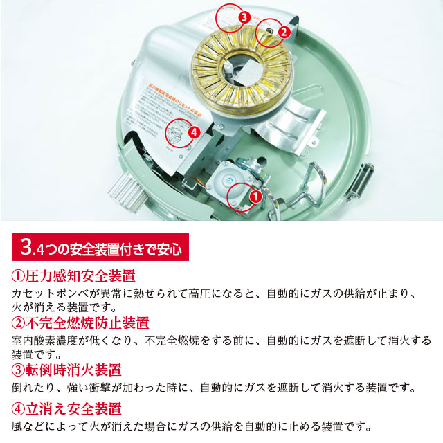 カセットボンベが異常に熱せられて高圧になると、自動的にガスの供給が止まり、火が消えます。