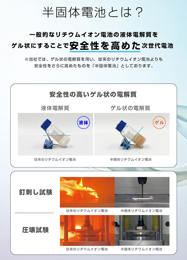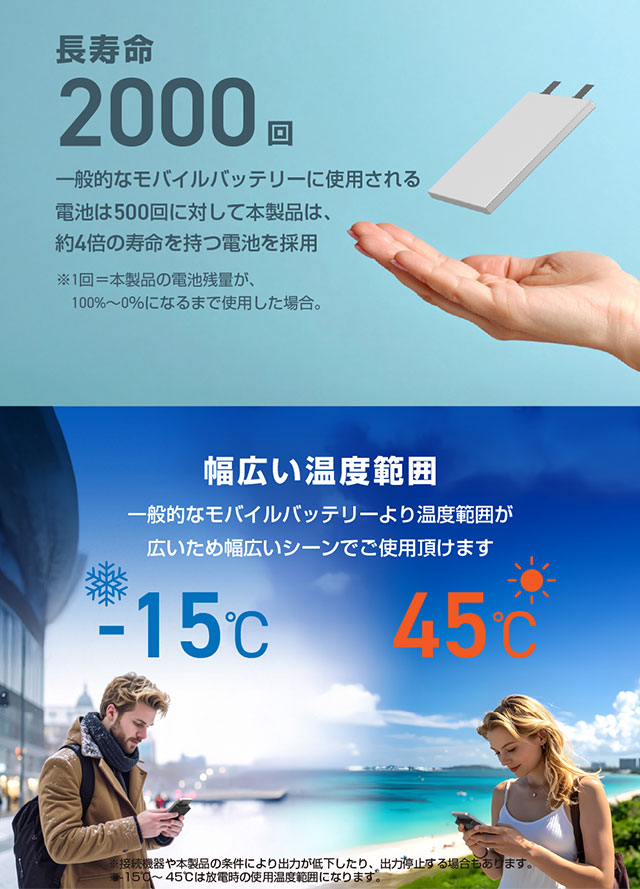 猛暑や極寒の環境でも使用でき、発火しにくい高い安全性と約2000サイクルの長寿命、優れた携帯性を実現。