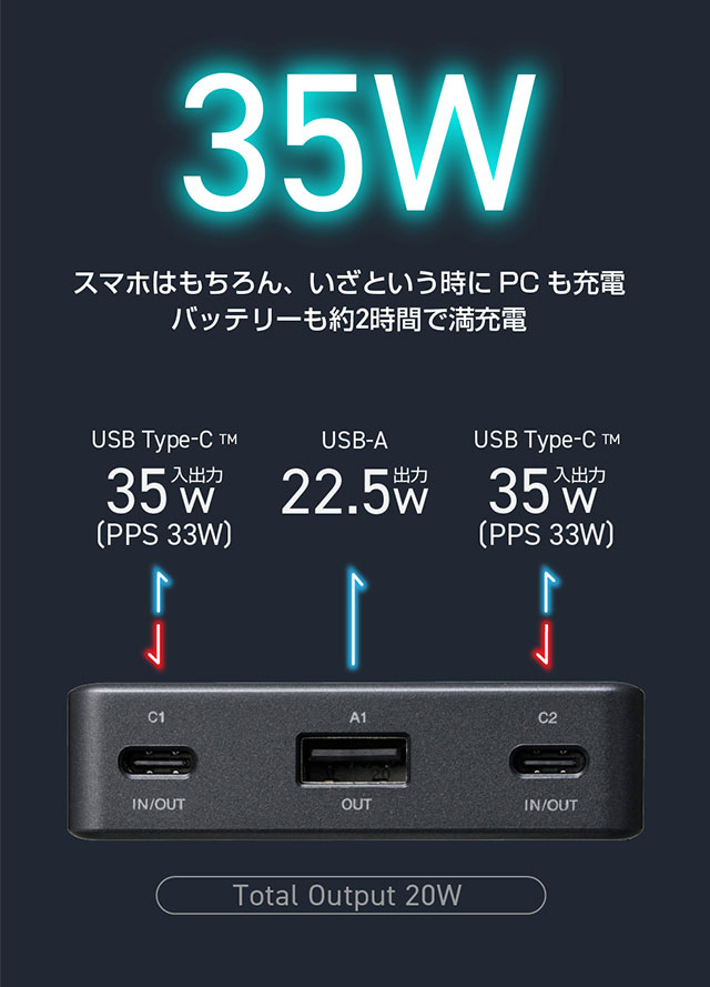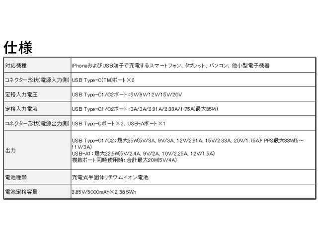 USB Type-C1/C2:最大35W(5V/3A、9V/3A、12V/2.91A、15V/2.33A、20V/1.75A)・PPS最大33W(5~11V/3A)
