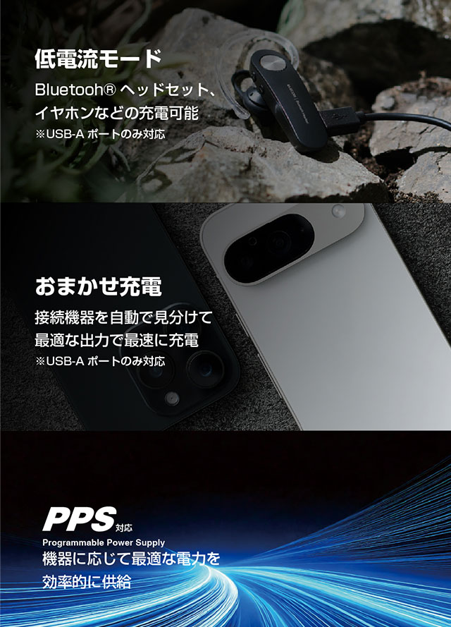 USB-A1:最大22.5W(5V/2.4A、9V/2A、10V/2.25A、12V/1.5A)、複数ポート同時使用時:合計最大20W(5V/4A)